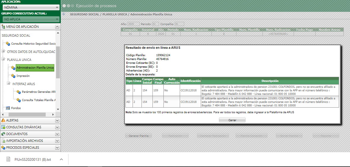 Al procesar la planilla se mostrará una pantalla de resultado indicando errores y alertas, así como se generará el archivo plano de aporte como normalmente lo hace.